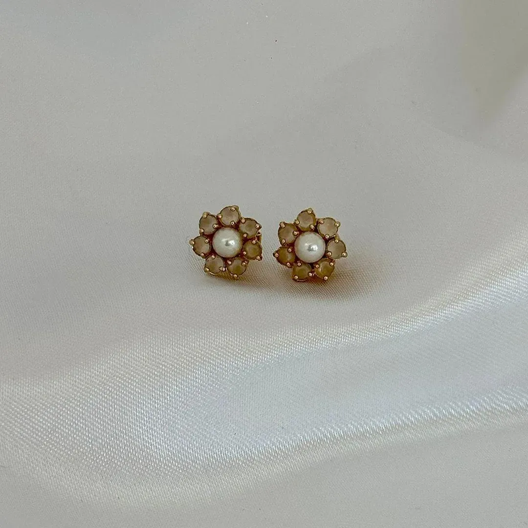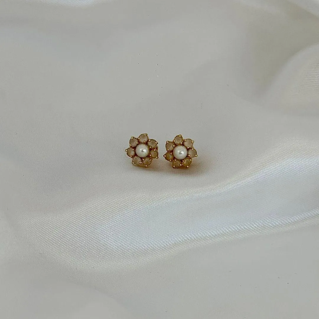 BRINCO DE FLOR COM PETALAS EM PEDRA E PEROLA - BANHO OURO 18KConfira opiniões e avaliações de clientes!