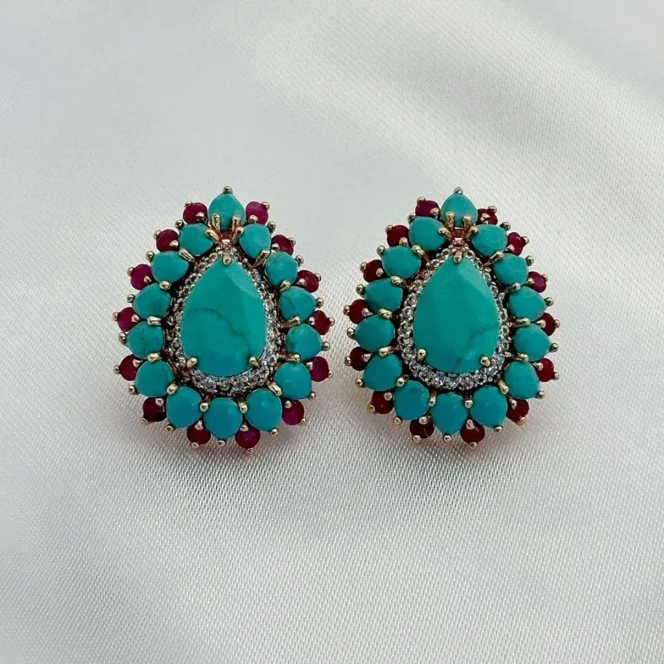 BRINCO GOTA NANO TURQUESA RUBY - CRAVEJADO ZIRCONIAS - BANHO DE OURO 18KConfira opiniões e avaliações de clientes!