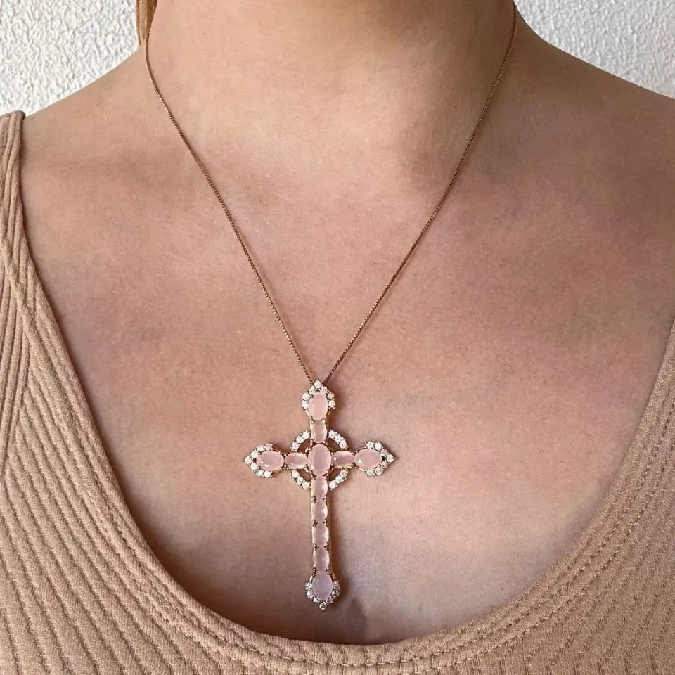 COLAR CRUZ - QUARTZO ROSA - BANHO OURO 18KConfira opiniões e avaliações de clientes!