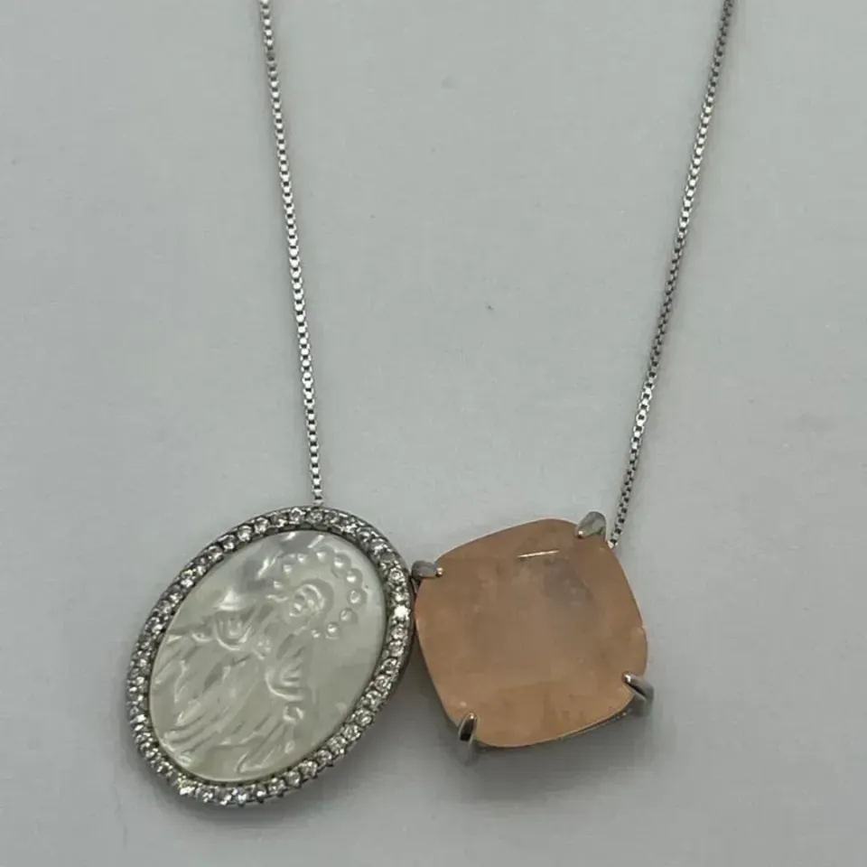 COLAR ESCAPULARIO NOSSA SENHORA DAS GRAÇAS - MADREPEROLA - TOPAZIO SALMÃO - BANHO DE RÓDIO BRANCOConfira opiniões e avaliações de clientes!